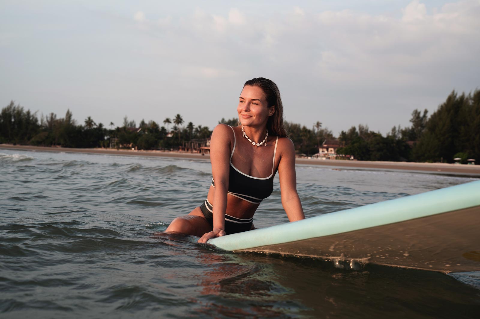 Surfing requires flexibility, so your bikini should allow you to move easily. Avoid uncomfortable details like bulky closures or metal rings that can dig in or break while you’re in the water.